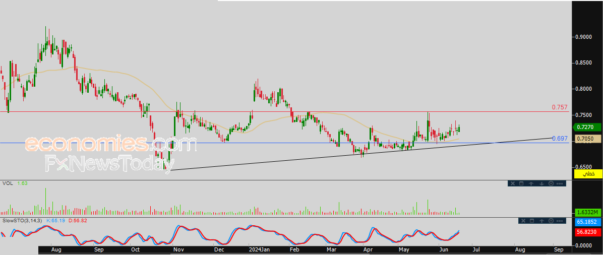 لذلك نحن نتوقع المزيد من الصعود لسعر السهم خلال تداولاته القادمة، بشرط ثبات مستوى الدعم 0.697، ليستهدف مستوى المقاومة المهم 0.757 استعداداً لمهاجمته.