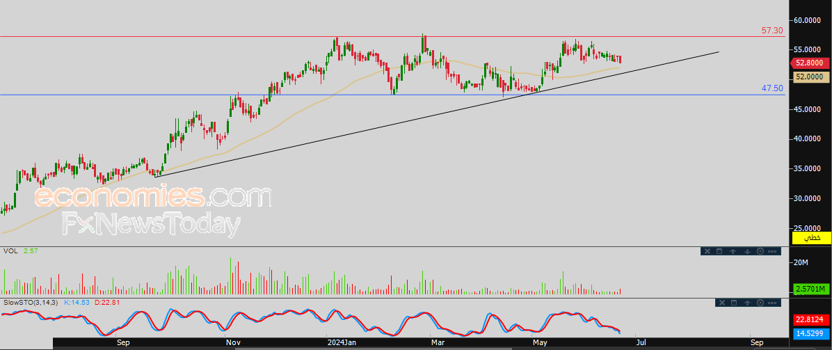 لهذا تشير توقعاتنا إلى ترجيح سيناريو عودة صعود سعر السهم خلال تداولاته القادمة، ليستهدف مستوى المقاومة المحوري والعنيد 57.30 استعداداً لمهاجمته.