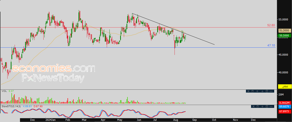 لذلك نحن نرجح عودة هبوط سعر السهم خلال تداولاته القادمة، طيلة ثبات مستوى المقاومة 52.80، ليستهدف مستوى الدعم المحوري 47.10.
