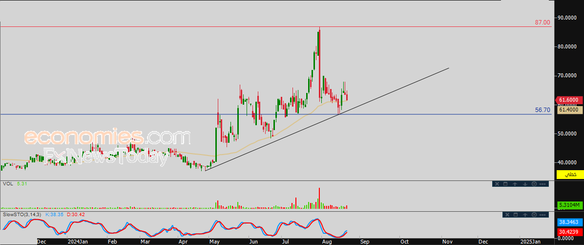 لهذا تشير توقعاتنا إلى ترجيح سيناريو عودة صعود سعر السهم خلال تداولاته القادمة، طيلة ثبات مستوى الدعم 56.70، ليستهدف مستوى المقاومة 87.00.