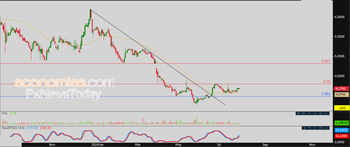 لذلك نحن نرجح عودة ارتفاع سعر السهم خلال تداولاته القادمة، ليستهدف مستوى المقاومة المحوري والقريب 4.30 استعداداً لمهاجمته.