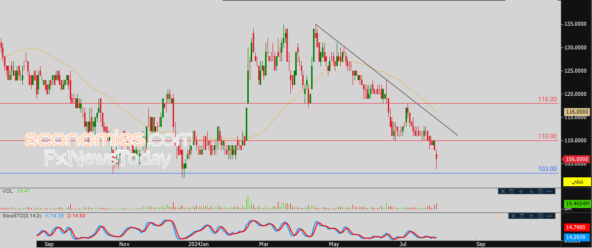 لذلك نحن نتوقع المزيد من الهبوط لسعر السهم خلال تداولاته القادمة، طيلة استقراره دون مستوى المقاومة 110.00، ليستهدف مستوى الدعم المحوري 103.00.