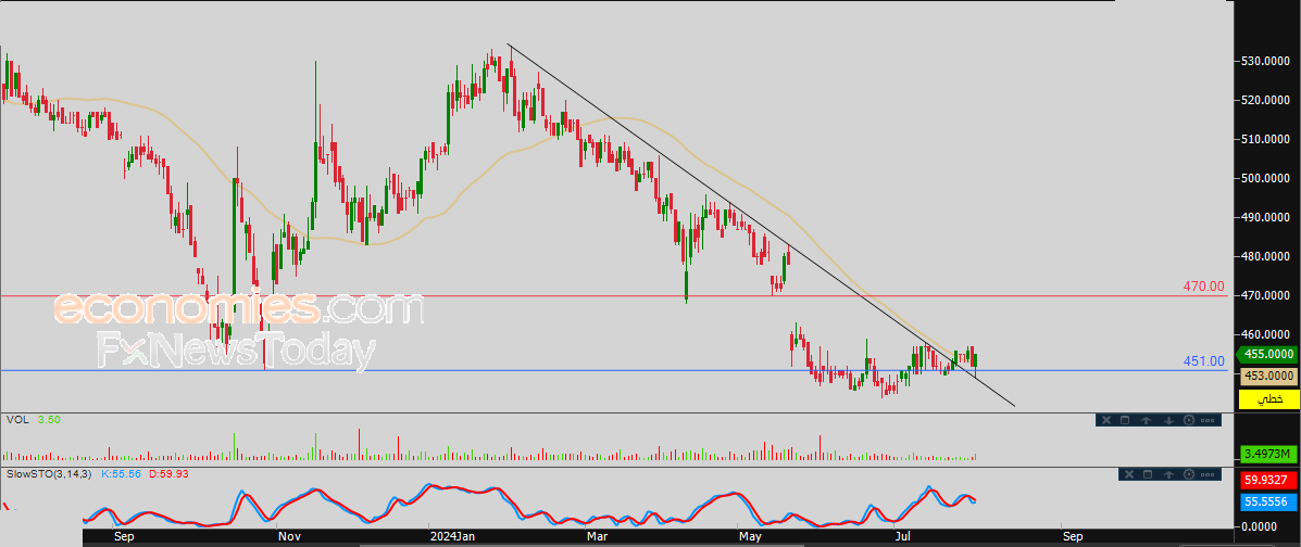 لذلك نحن نتوقع المزيد من الصعود لسعر السهم خلال تداولاته القادمة، طيلة استقراره فوق مستوى 451.00، ليستهدف مستوى المقاومة 470.00.