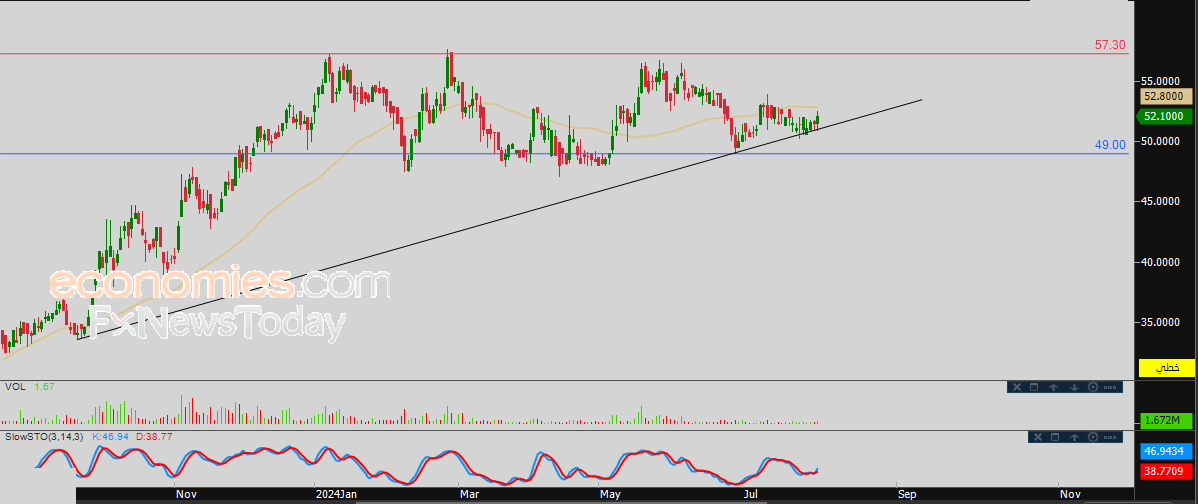 لهذا تشير توقعاتنا إلى المزيد من الصعود لسعر السهم خلال تداولاته القادمة، طيلة ثبات مستوى الدعم 49.00، ليستهدف مستوى المقاومة المحوري 57.30.