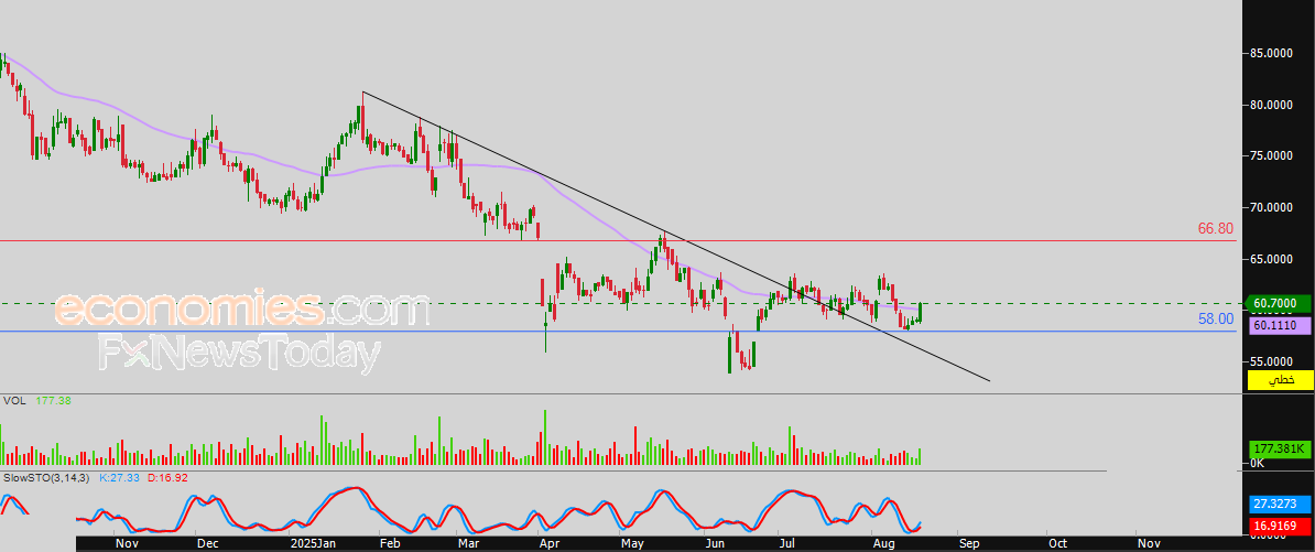 لذلك تشير توقعاتنا إلى ارتفاع سعر السهم خلال تداولاته القادمة، طيلة ثبات مستوى الدعم 58.00 ريال، ليستهدف مستوى المقاومة 66.80 ريال.