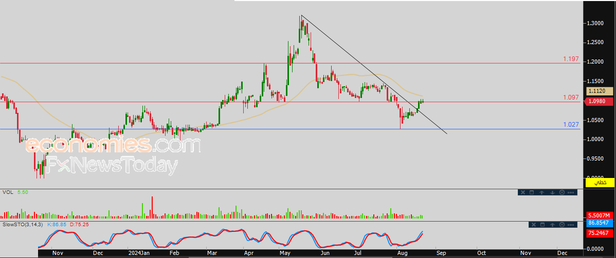 لهذا فتوقعاتنا تقف على الحياد انتظاراً لسلوك السهم حيال مستوى المقاومة 1.097، ففي حالة اختراق تلك المقاومة سيفتح المجال أمام السهم لتحقيق المزيد من المكاسب، ليستهدف بعدها مستوى المقاومة 1.197.