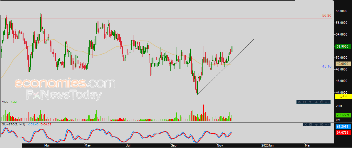 لذلك نحن نتوقع المزيد من الصعود لسعر السهم خلال تداولاته القادمة، ليستهدف مستوى المقاومة المحوري 56.80، وذلك طيلة ثبات مستوى الدعم 48.10.