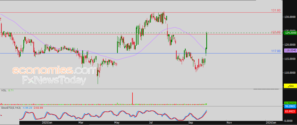 بناءاً على ذلك تشير توقعاتنا إلى صعود سعر السهم خلال تداولاته القادمة، خاصة في حالة اختراقه للمقاومة المذكورة 123.80 ريال، ليستهدف بعدها مستوى المقاومة المحوري 131.60 ريال.