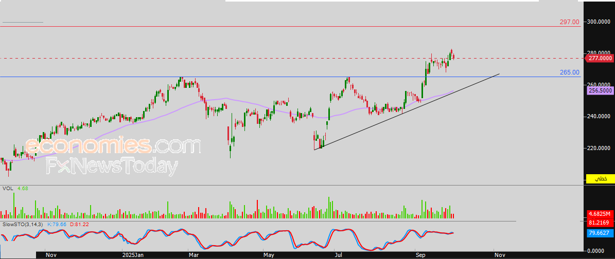 لذلك فتوقعاتنا تشير إلى صعود سعر السهم خلال تداولاته القادمة، طيلة ثبات مستوى الدعم 265.00 دينار، ليستهدف مستوى المقاومة 297.00 دينار.