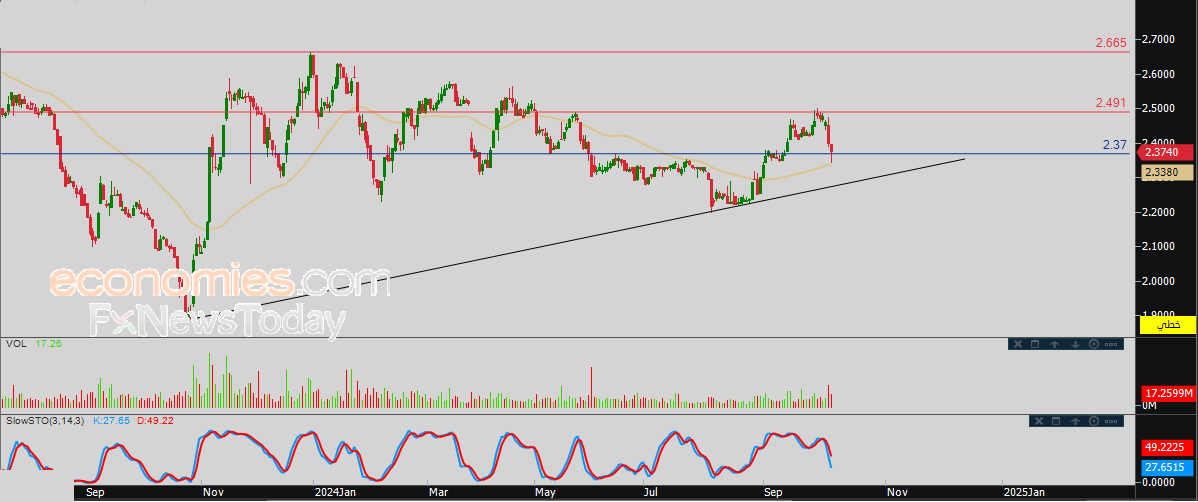 لهذا تشير توقعاتنا إلى ترجيح سيناريو عودة صعود سعر السهم خلال تداولاته القادمة، طيلة ثبات مستوى الدعم 2.37، ليستهدف أولى مستويات المقاومة عند 2.491.