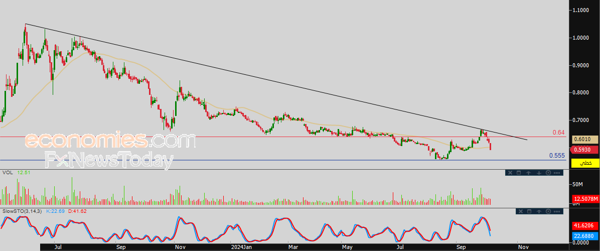 لذلك نحن نتوقع المزيد من الهبوط لسعر السهم خلال تداولاته القادمة، طيلة استقراره دون مستوى المقاومة 0.64، ليستهدف مستوى الدعم المحوري 0.555.