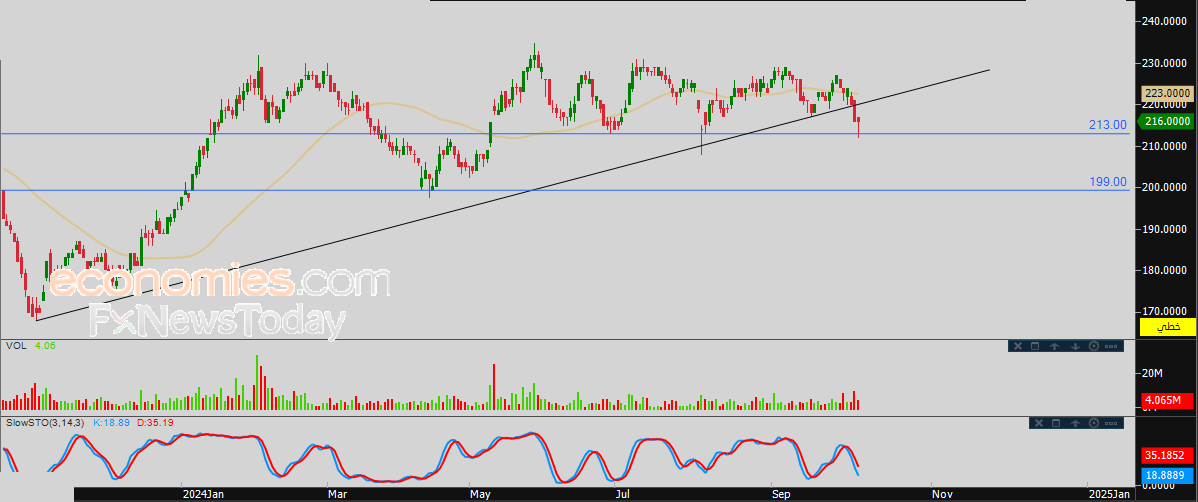 لذلك نحن نتوقع المزيد من الهبوط لسعر السهم خلال تداولاته القادمة، خاصة في حالة كسره لمستوى الدعم السابق ذكره 213.00، ليستهدف بعدها مستوى الدعم 199.00.