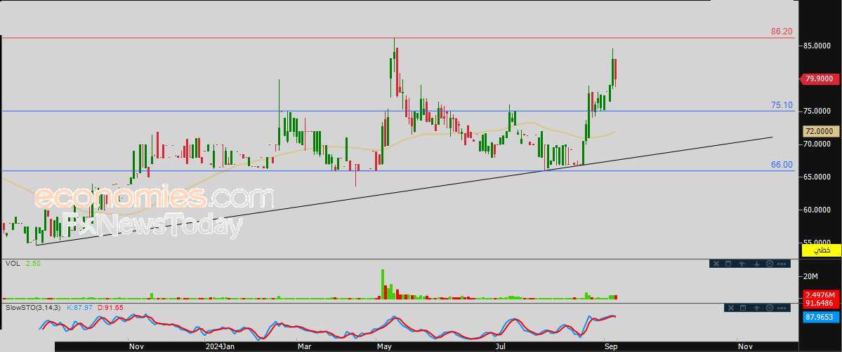 لذلك نحن نرجح عودة صعود سعر السهم خلال تداولاته القادمة، طيلة ثبات مستوى الدعم 75.10، ليستهدف مستوى المقاومة المحوري 86.20.