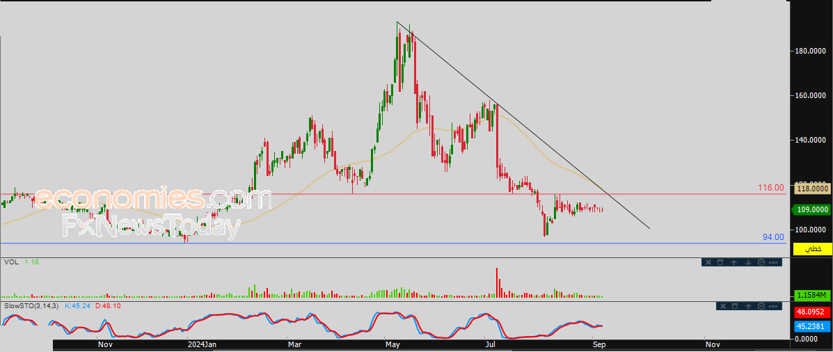 لهذا تشير توقعاتنا إلى ترجيح سيناريو عودة هبوط سعر السهم خلال تداولاته القادمة، طيلة ثبات مستوى المقاومة 116.00، ليستهدف مستوى الدعم المحوري 94.00.
