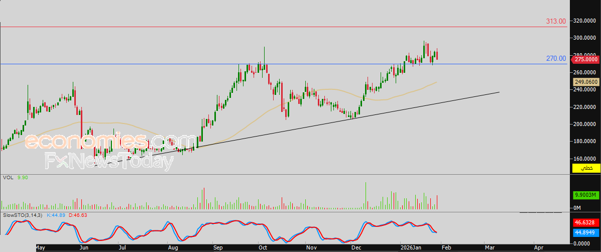 لذلك تشير توقعاتنا إلى صعود سعر السهم خلال تداولاته القادمة، خاصة طيلة استقراره اعلى الدعم 270.00 دينار، ليستهدف مستوى المقاومة 313.00 دينار.