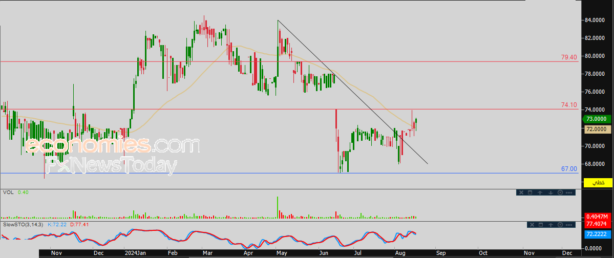 لذلك نحن نتوقع المزيد من الصعود لسعر السهم خلال تداولاته القادمة، خاصة في حالة اختراقه للمقاومة 74.10، ليستهدف بعدها مستوى المقاومة 79.40.