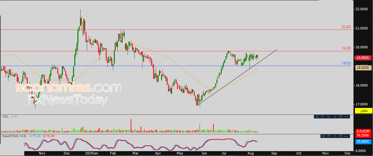 لذلك نحن نرجح عودة ارتفاع سعر السهم خلال تداولاته القادمة، خاصة في حالة اختراقه للمقاومة 19.80، ليستهدف بعدها مستوى المقاومة 20.90.