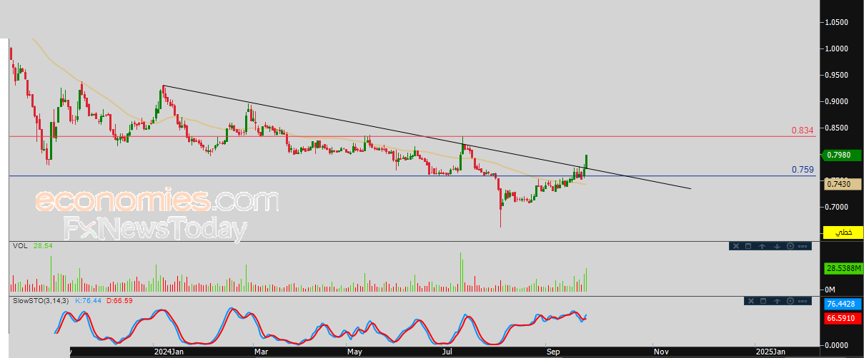 لهذا تشير توقعاتنا إلى المزيد من الصعود لسعر السهم خلال تداولاته القادمة، طيلة استقراره أعلى مستوى 0.759، ليستهدف أولى مستويات المقاومة عند 0.834.
