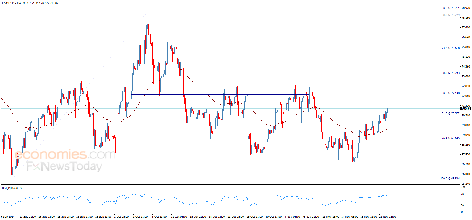 أغلق سعر النفط شمعة الأربع ساعات الأخيرة فوق مستوى 70.58$، ليستأنف تداولاته الإيجابية الآن ويؤكد استمرار سيطرة الاتجاه الصاعد خلال الجلسات القادمة، والطريق مفتوح أمام تحقيق هدفنا التالي عند 72.15$، مع الإشارة إلى أن اختراق هذا المستوى سيمد الموجة الصاعدة لتصل إلى مناطق 73.71$ على المدى القريب.