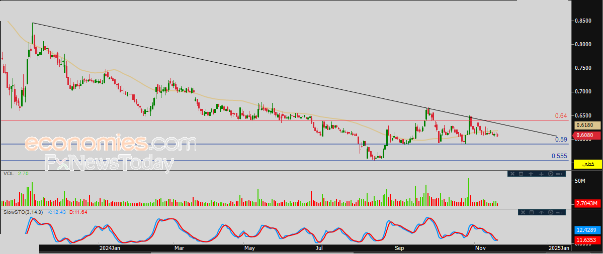 لذلك نحن نتوقع انخفاض سعر السهم خلال تداولاته القادمة، طيلة ثبات مستوى المقاومة 0.64، ليستهدف أولى مستويات الدعم عند سعر 0.59 ريال.