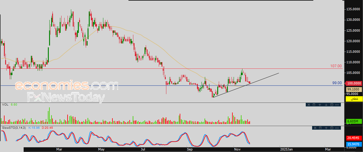 لذلك نحن نرجح عودة صعود سعر السهم خلال تداولاته القادمة، بشرط ثبات مستوى الدعم 99.00، ليستهدف من جديد مستوى المقاومة 107.00.