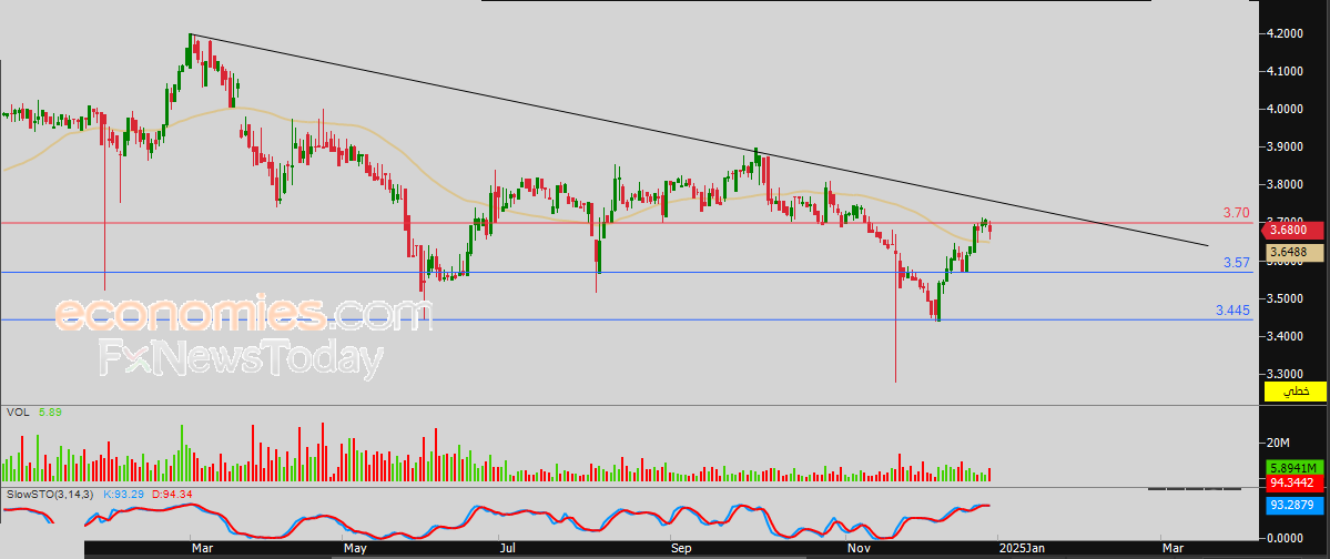 لهذا فتوقعاتنا تشير إلى المزيد من الهبوط لسعر السهم خلال تداولاته القادمة، طيلة استقراره دون مستوى المقاومة 3.70، ليستهدف أولى مستويات الدعم عند سعر 3.57 ريال.