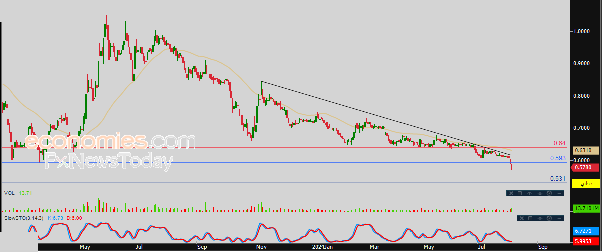 لذلك نحن نتوقع المزيد من الهبوط لسعر السهم خلال تداولاته القادمة، خاصة طيلة استقراره دون مستوى 0.593، ليستهدف مستوى الدعم 0.530.