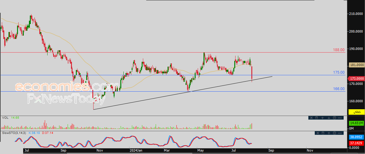 لهذا فتوقعاتنا ترجح عودة صعود سعر السهم خلال تداولاته القادمة، ولكن بشرط عليه أولاً عودة الاستقرار فوق مستوى 175.00، ليستهدف بعدها مستوى المقاومة المحوري 188.00.