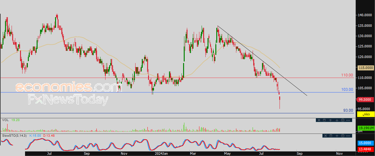 لهذا فتوقعاتنا تشير إلى استمرار هبوط سعر السهم خلال تداولاته القادمة، طيلة استقراره دون مستوى 103.00، ليستهدف أولى مستويات الدعم عند سعر 93.00 دينار.