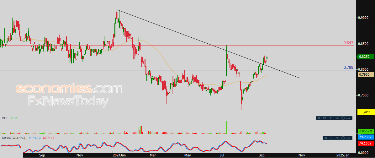 لهذا فتوقعاتنا تشير إلى المزيد من الصعود لسعر السهم خلال تداولاته القادمة، طيلة ثبات مستوى الدعم 0.799، ليستهدف مستوى المقاومة السابق ذكره 0.847 استعداداً لمهاجمته.
