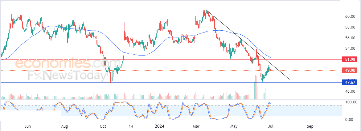 لهذا فتوقعاتنا تشير إلى المزيد من الهبوط لسعر السهم خلال تداولاته القادمة، طيلة ثبات مستوى المقاومة 52.00$، ليستهدف مستوى الدعم المحوري 47.70$.
