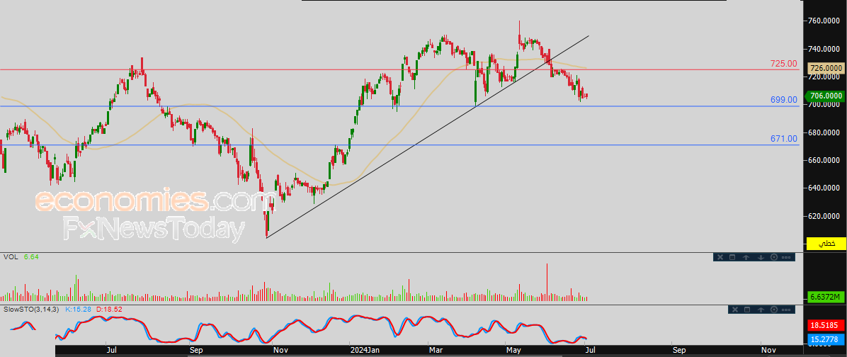 لهذا تشير توقعاتنا إلى انخفاض سعر السهم خلال تداولاته القادمة، طيلة ثبات المقاومة 725.00، ليستهدف أولى مستويات الدعم عند سعر 699.00 استعداداً لكسره.