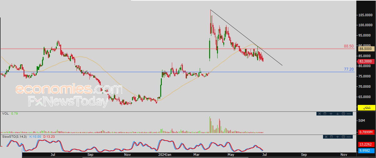 لذلك نحن نتوقع المزيد من الهبوط لسعر السهم خلال تداولاته القادمة، طيلة ثبات المقاومة 88.50، ليستهدف مستوى الدعم 77.20.