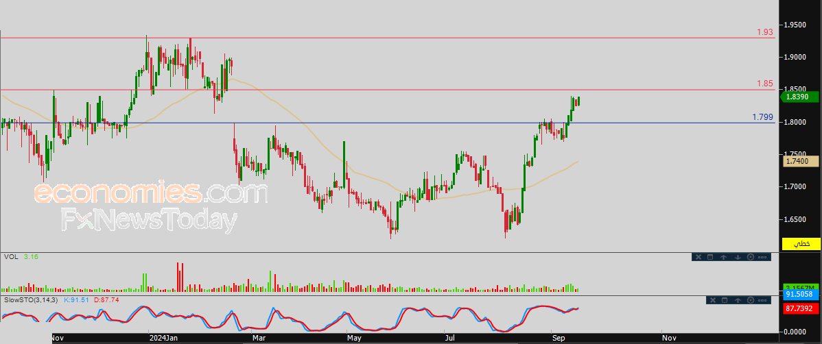 لهذا تشير توقعاتنا إلى المزيد من الصعود لسعر السهم خلال تداولاته القادمة، ليستهدف بعدها مستوى المقاومة المحوري خاصة في حالة اختراقه لمستوى المقاومة 1.85، ليستهدف بعدها مستوى المقاومة المحوري 1.93.