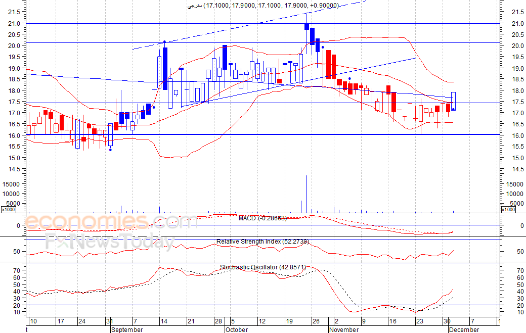 متوقع ان يكون النطاق السعري خلال اليوم الحالي بين مستوى الدعم هو 17.5 بينما مستوى المقاومة هو 18.2 فلس