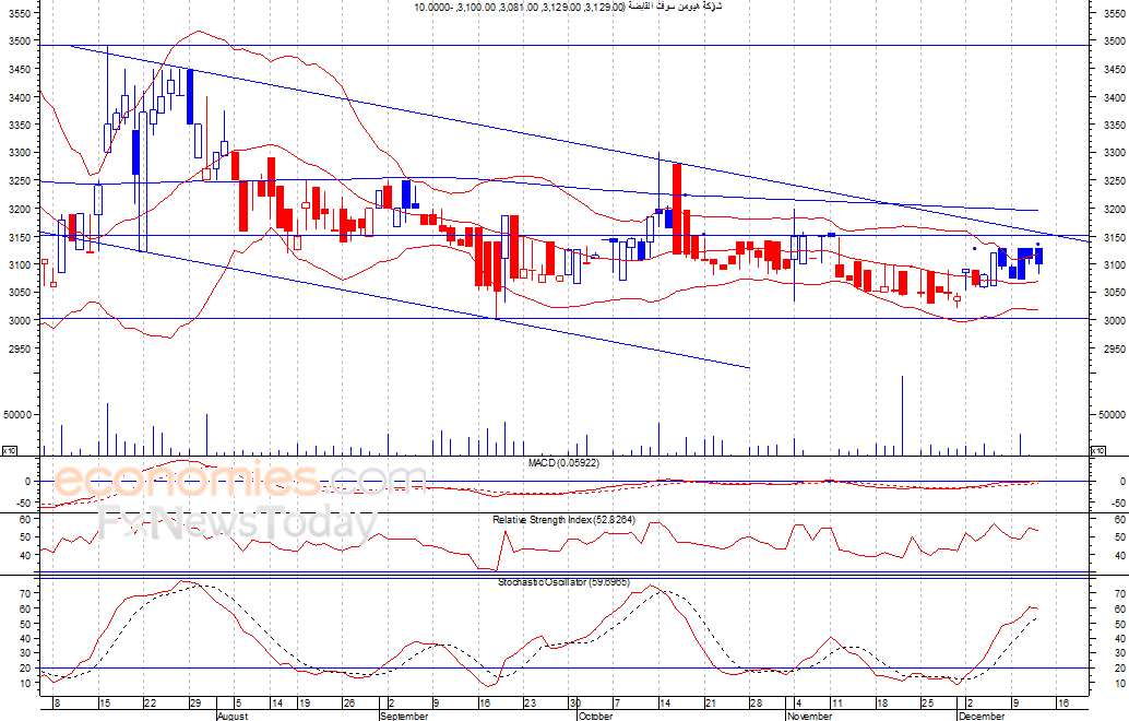 من المتوقع ان يكون النطاق السعري خلال جلسة اليوم بين مستوى الدعم هو 3055 فلس وبين مستوى المقاومة هو 3125 فلس