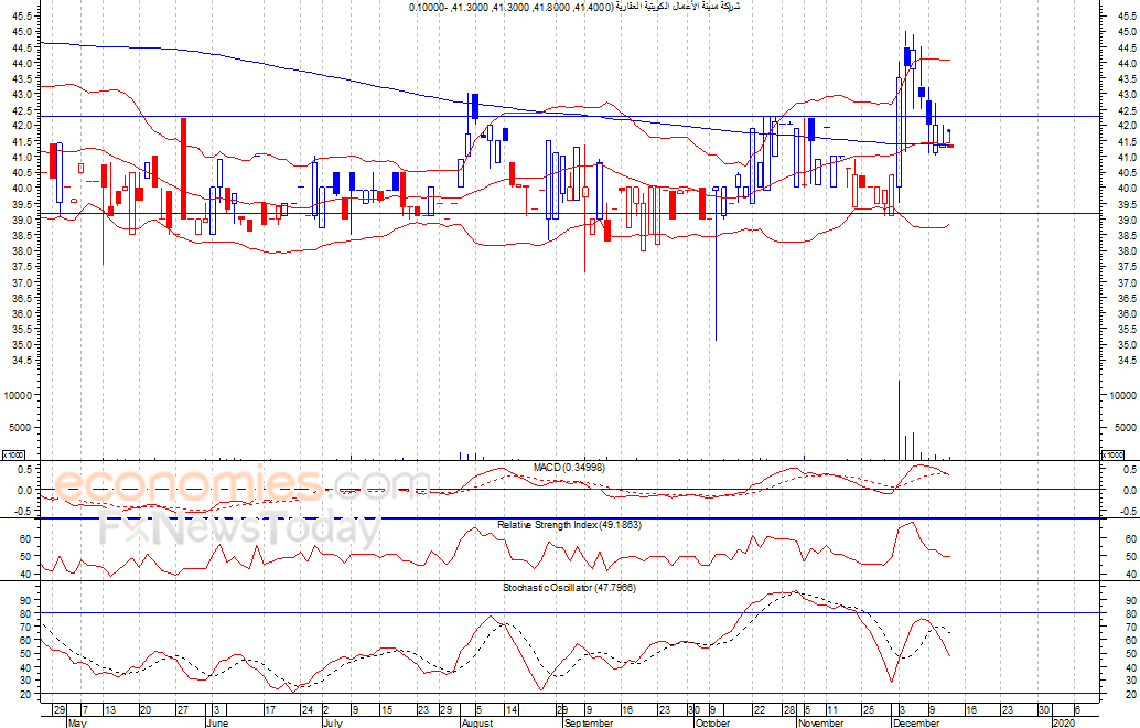 من المتوقع ان يكون النطاق السعري خلال جلسة اليوم بين مستوى الدعم هو 41.0 فلس وبين مستوى المقاومة هو 41.6 فلس