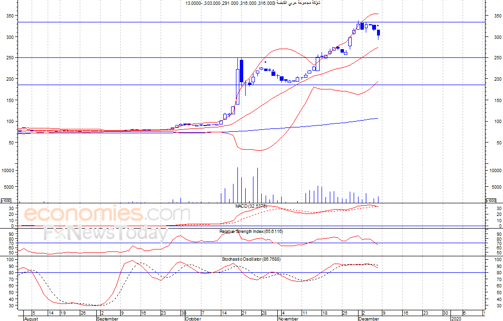 تراجع السهم لينهي تداولات امس الاحد عند مستوى 303 فلس، وذلك على خلفية تلقيه مقاومة عند مستوى 330 فلس، وبالنظر الى المؤشرات الفنية مثل مؤشر القوة النسبية، نلاحظ انطلاق اشارة بيع، لذلك نتوقع عمليات جني ارباح قد تهبط به لمستوى الدعم 250 فلس، شرط ثبات السهم اسفل مستوى 330 فلس.