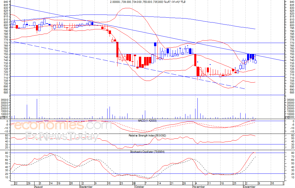 انخفض السهم بشكل طفيف نهاية تداولات امس الاحد ليغلق عند مستوى 739 فلس، وذلك بعدما تلقى مقاومة قوية ناتجة من ملامسته للحد العلوي للقناة الهابطة متوسطة الأجل، لذلك نتوقع تراجعا خلال الايام والاسابيع القادمة للوصول لمستوى الدعم الهام عند 710 فلس، شرط بقاء السهم اسفل مستوى 750 فلس.