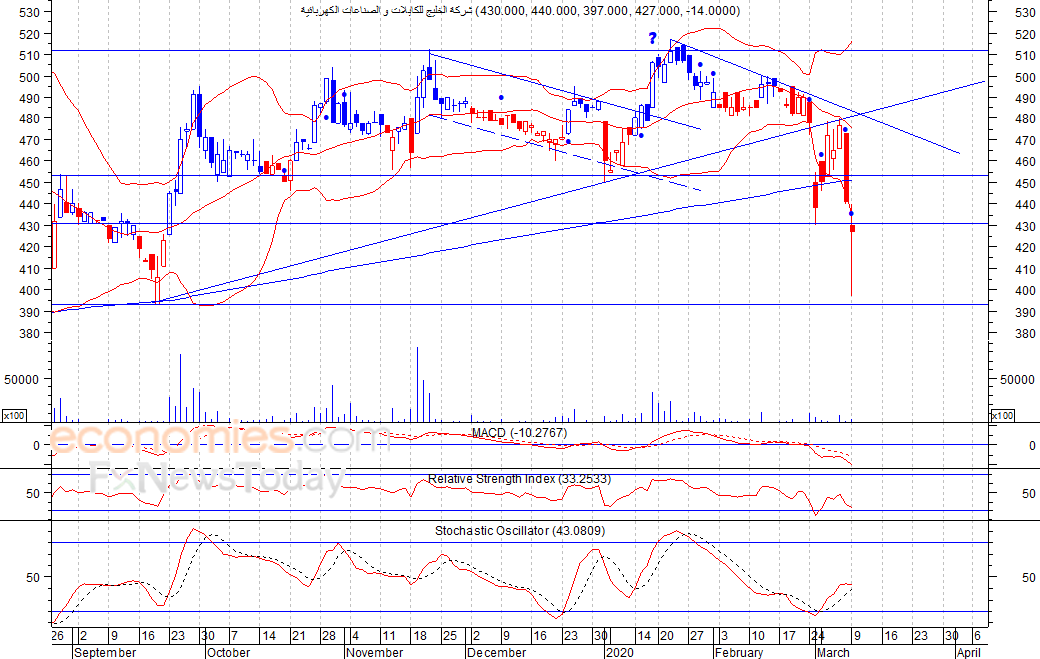 متوقع ان يكون النطاق السعري خلال اليوم الحالي بين مستوى الدعم هو 402.7 بينما مستوى المقاومة هو 445.7 فلس