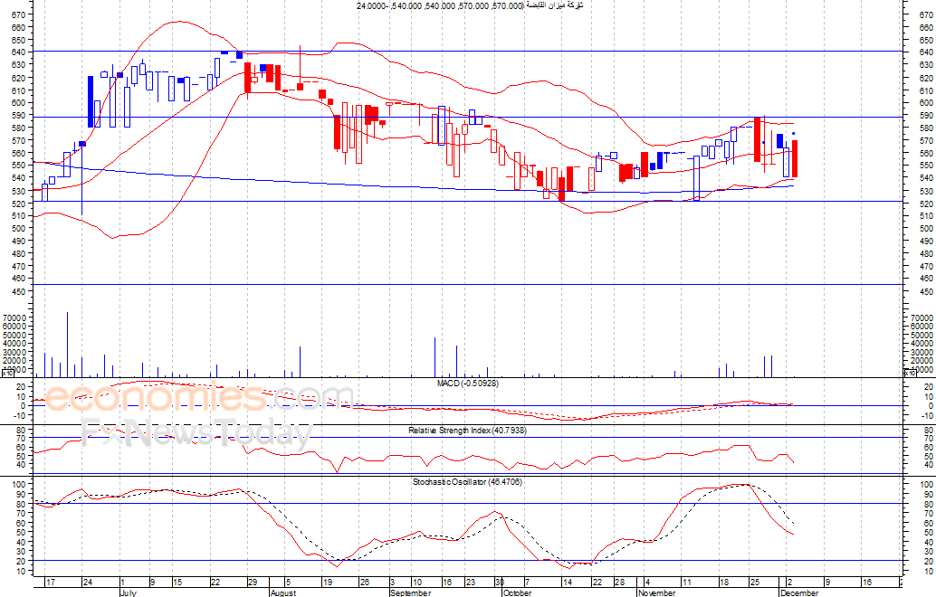 من المتوقع ان يكون النطاق السعري خلال جلسة اليوم بين مستوى الدعم هو 520.0 فلس وبين مستوى المقاومة هو 550.0 فلس