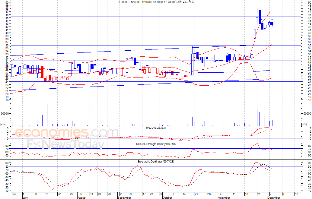 من المتوقع ان يكون النطاق السعري خلال جلسة اليوم بين مستوى الدعم هو 41.0 فلس وبين مستوى المقاومة هو 43.5 فلس