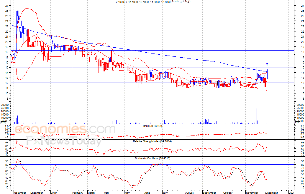 من المتوقع ان يكون النطاق السعري خلال جلسة اليوم بين مستوى الدعم وهو 13.5 وبين مستوى المقاومة هو 16.0 فلس