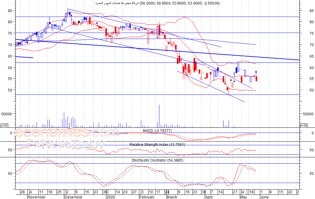 متوقع ان يكون النطاق السعري خلال اليوم الحالي بين مستوى الدعم هو 52.2 بينما مستوى المقاومة هو 57.2 فلس