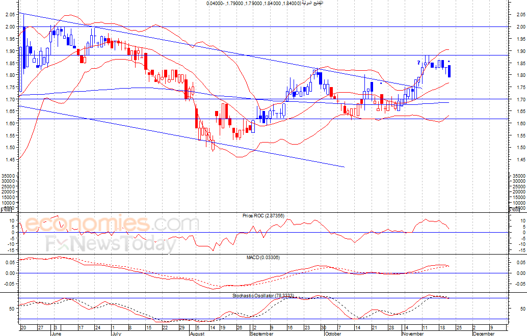 من المتوقع ان يكون النطاق السعري خلال جلسة اليوم بين مستوى الدعم هو 20.9 فلس وبين مستوى المقاومة هو 22.3 فلس