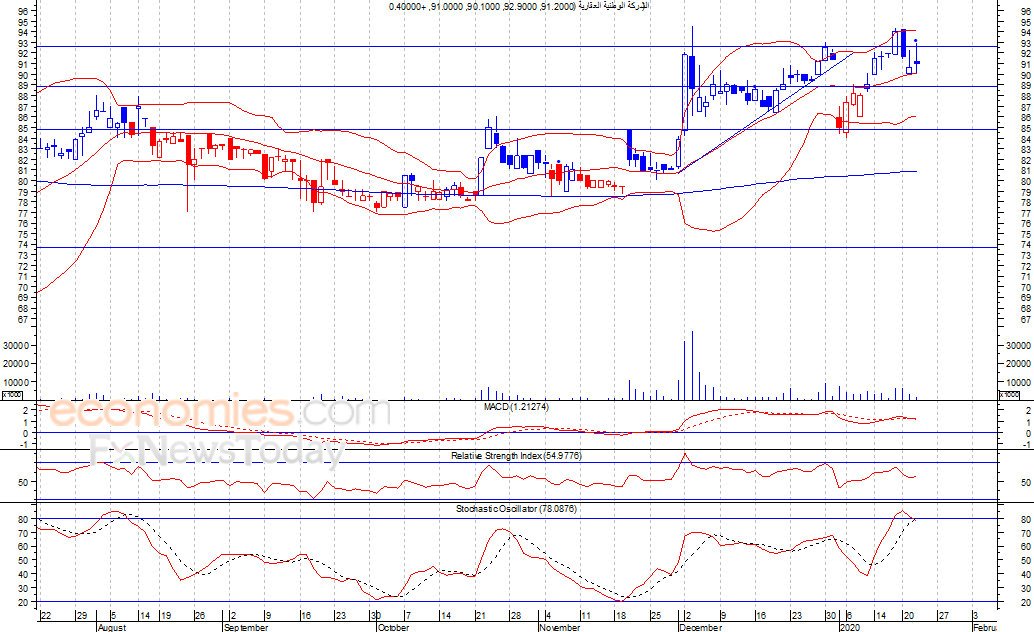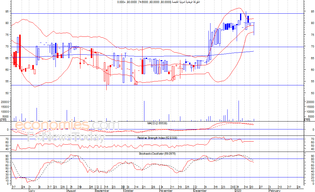 انهى السهم تداولات امس الاربعاء عند نفس سعر الفتح وايضا هو سعر الاغلاق لجلسة الثلاثاء الماضي، حيث اغلق عند مستوى 80 فلس، في ظل ظهور انحراف سلبي على مؤشر القوة النسبية، مما يجعل الانظار تتجه لاسفل لمستوى الدعم 70 فلس في عملية جني ارباح في الاجل القصير، شرط بقاء السهم اسفل مستوى 84 فلس.
