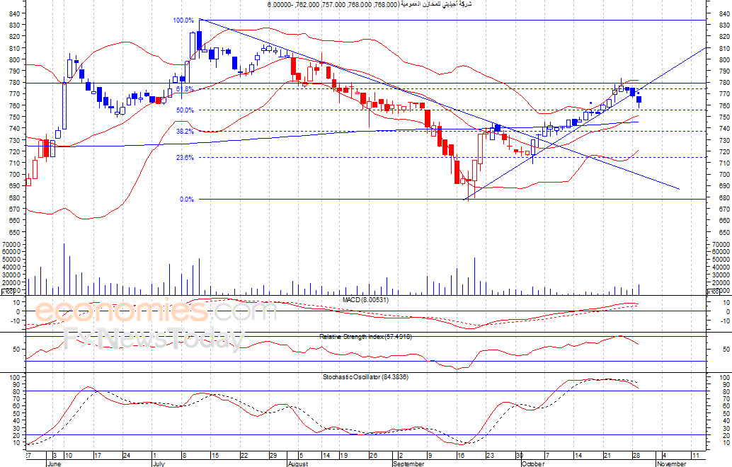 تراجع السهم لثالث جلسة على التوالي، حيث اغلق امس الثلاثاء عند مستوى 762 فلس منخفضا، في ظل ارتفاع في كمية التداول، وهو ما يعد إشارة سلبية، كما انزلق السهم خط الاتجاه الصاعد قصير الأجل، مما يفتح الباب أمام السهم لمزيد من الانخفاض لمستويات قد تصل إلى 740 فلس كمستوى أول ثم 710 فلس كمستوى ثان، شرط بقاء السهم اسفل مستوى 780 فلس.س