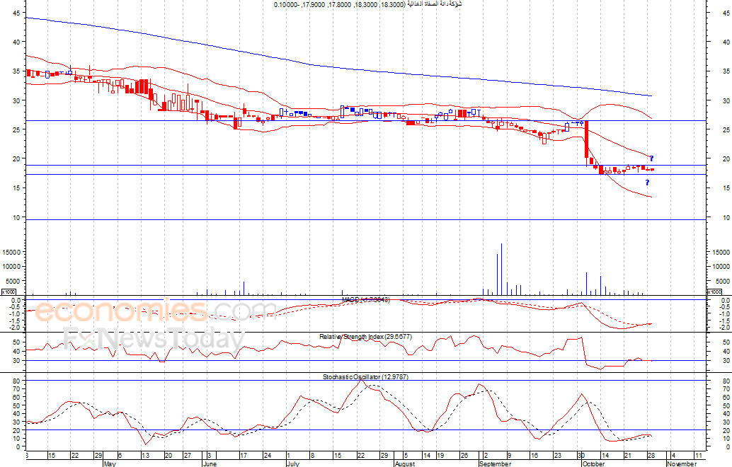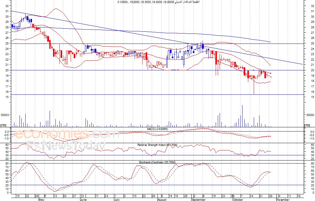 أنهي السهم تداولات امس الثلاثاء منخفضا عند مستوى 18.80 فلس، ليواصل بذلك سلسلة من الانخفاضات والتي بداها منذ منتصف الشهر الماضي، مصحوبا بتدني كمية التداول مقارنة بمتوسطها الشهري، كما تعكس المؤشرات الفنية مثل مؤشر استوكاستيك إشارة سلبية، لذلك نتوقع أن يشهد السهم تراجعا خلال الأيام والأسابيع القادمة للوصول لمستوى الدعم 15.50 فلس، شرط بقاء السهم اسفل مستوى 20 فلس.
