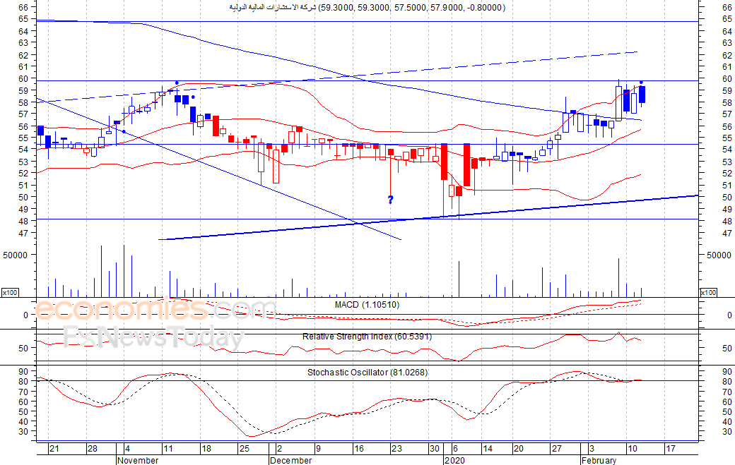 تراجع السهم لينهي تداولات الثلاثاء الماضي عند مستوى 57٫90 فلس، وذلك بعدما تلقى مقاومة قوية عند مستوى 60 فلس، كما نلاحظ ملامسة السهم للحد العلوي لمؤشر "Bollinger Bands” والذي يشكل مقاومة قد تعيد اختبار السهم لمستوى الدعم 54٫50 فلس كمستوى اول، شرط بقاء السهم اسفل مستوى 60 فلس.