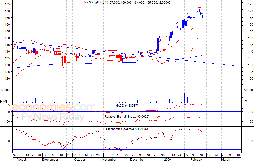 انخفض السهم لثالث جلسة على التوالي، حيث اغلق امس الأربعاء عند مستوى 165 فلس، وذلك بعدما تلقى مقاومة قوية عند مستوى 171 فلس، وفي ظل انطلاق إشارة بيع على مؤشر القوة النسبية، لذلك نتوقع عمليات جني أرباح قد تصل بالسهم لمستوى الدعم 154 فلس كمستوى أول، شرط بقاء السهم اسفل مستوى 172 فلس.